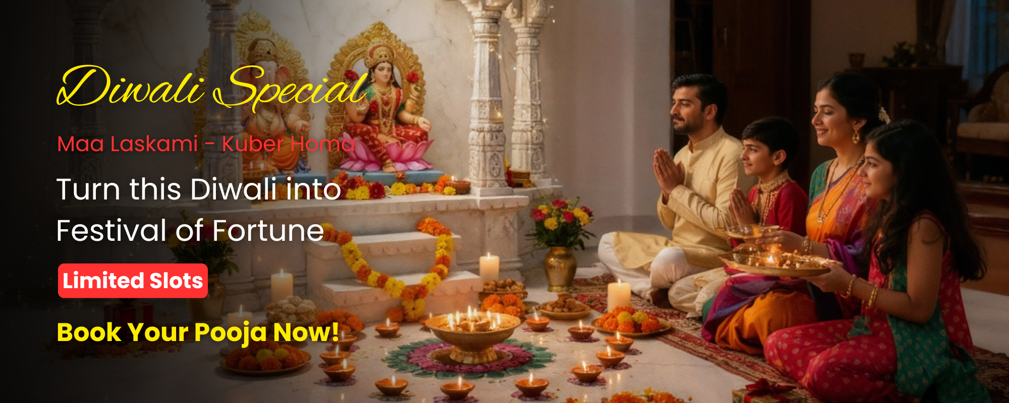 Book Diwali Lakshmi-Kuber Homa online! Expert Pandits perform personalized puja on your behalf at sacred temple. Get live WhatsApp updates, puja video, and Prasad delivered home. Ideal for busy families & NRIs. Remove financial obstacles and attract prosperity from anywhere!